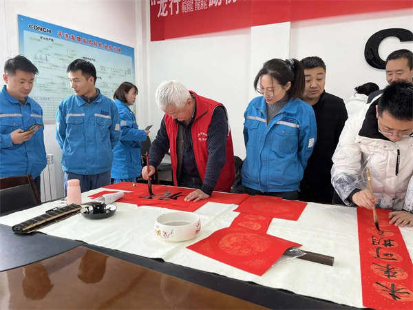 春聯,表達著人們對新年迎祥納福的美好愿望。連日來,各地的書法家與海螺書法愛好者現場揮毫潑墨,寫春聯、送福字,壓紙、沾墨、起筆、收筆,一起一落之間,一幅幅寫滿祝福的春聯躍然紙上,將廣大員工對美好生活的向往書寫得淋漓盡致。還有的員工把對海螺的祝福寫進了對聯,一起來看看吧!