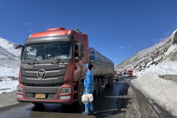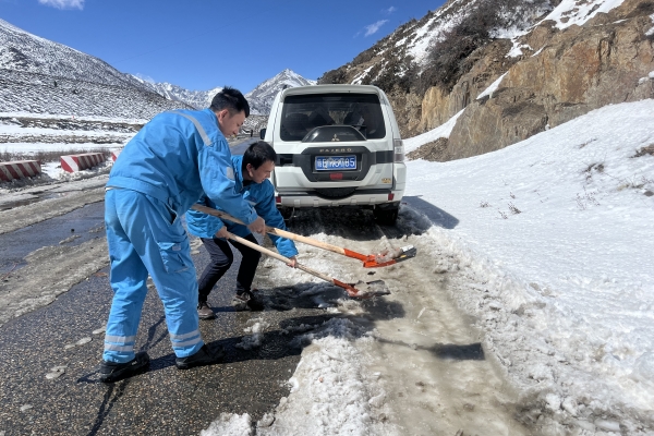 西藏八宿海螺學雷鋒志愿服務隊組織清理318國道積雪,并為滯留司機發放午餐。