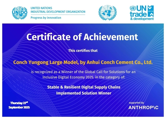 近日,海螺集團下屬“安徽海螺水泥股份有限公司——海螺云工大模型”在聯合國工業發展組織等機構于2025年7月發起的“2025包容性數字經濟全球解決方案征集”中,榮獲: 穩定與韌性的數字供應鏈 類別 最佳實施方案獎 獎項。